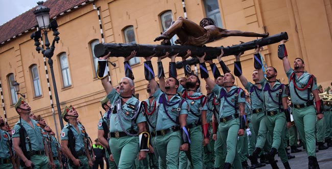 Quizás el espectáculo más evidente de lo que digo es el transporte de un Cristo (creo que le llaman de la Buena Muerte) por unos legionarios al cántico de ese himno fascistoide y siniestro de “El novio de la Muerte”, coreado nada menos que por cuatro ministros de España. Cruz y Espada. En este caso pistolas portadas por uno de los cuerpos militares de historial más espeluznante.