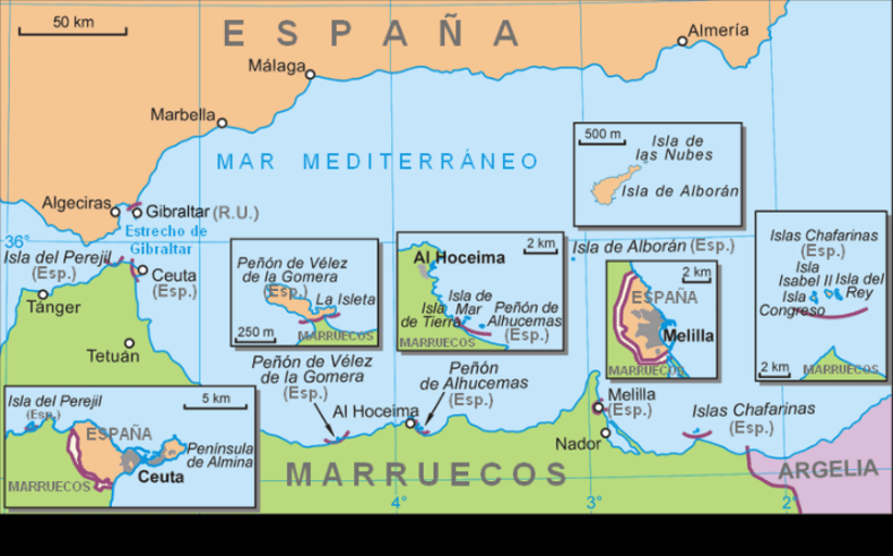- En primer lugar, la cuestión de los territorios de España en África (Ceuta, Melilla, Islas Chafarinas y Peñones), siempre latente, que resurge una y otra vez, utilizada por el régimen marroquí de modo nacionalista como medio para cubrir los conflictos internos. Hasta ahora no ha llegado la sangre al río en ningún momento, pero sin duda se trata de un tema de difícil solución, por lo menos en lo que a Ceuta y Melilla se refiere, no tanto con respecto a Chafarinas y Peñones (Perejil, Alhucemas y Vélez de la Gomera), una cuestión de buena voluntad y menos testosterona nacionalista.